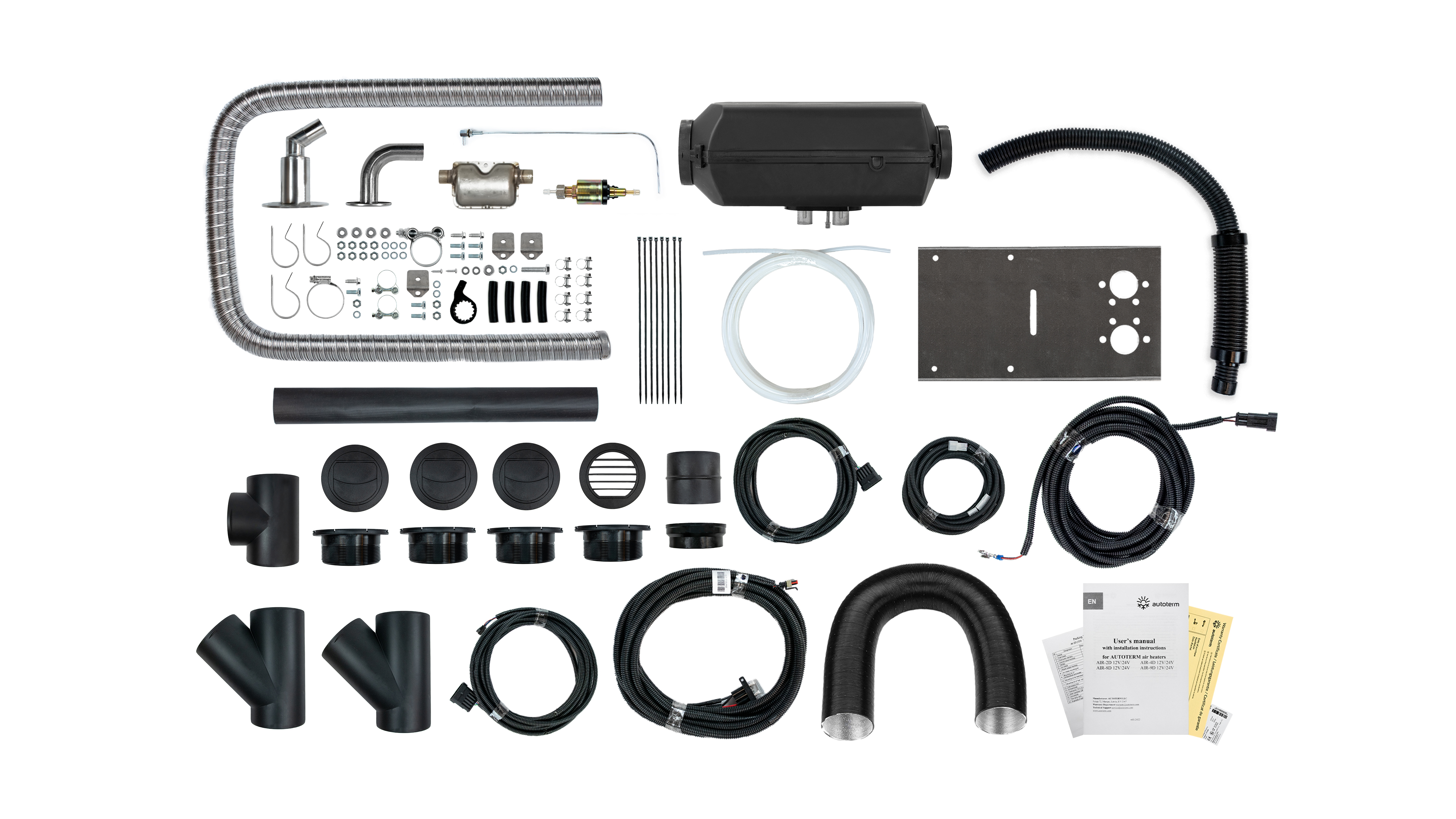 Completo kit de instalación con calefactor de aire Autoterm 4D y un conjunto de accesorios especialmente pensados para instalar en una embarcación mediana (15 m / 48 pies)