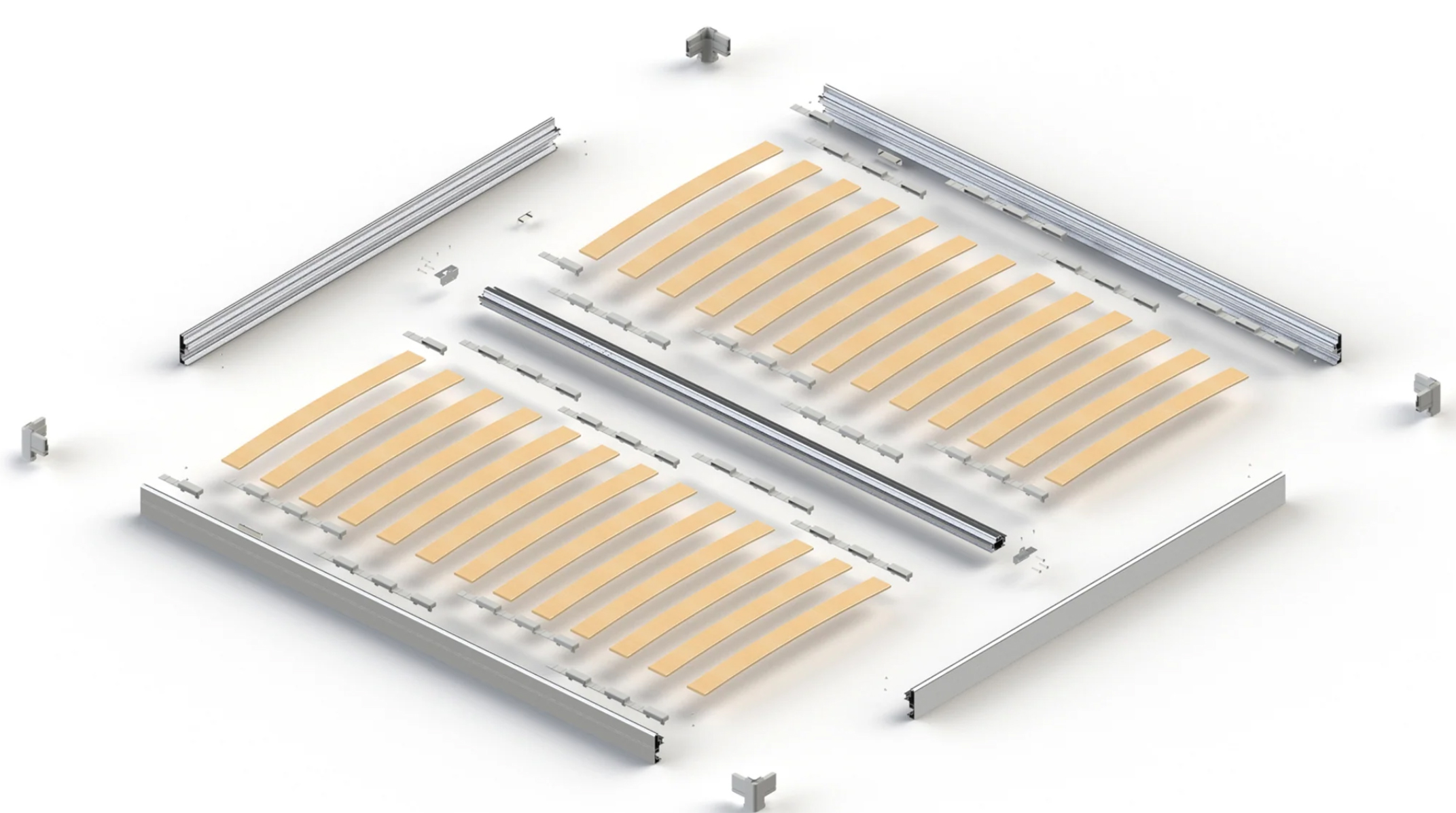La base de cama para furgones Van Bed utiliza el sistema Smart Bed Frame, un sistema modular que se compone de perfiles de aluminio, los cuales se pueden cortar a medida para crear una cama de tamaño personalizado, con listones de madera como somier tambíen de fácil corte. La base total de la cama es de 1920x1220mm (1,92 x 1,22 metros) la cual puede ser ajustada al tamaño que se necesite.- Estructura de aluminio resistente pero liviana con listones de madera como somier.