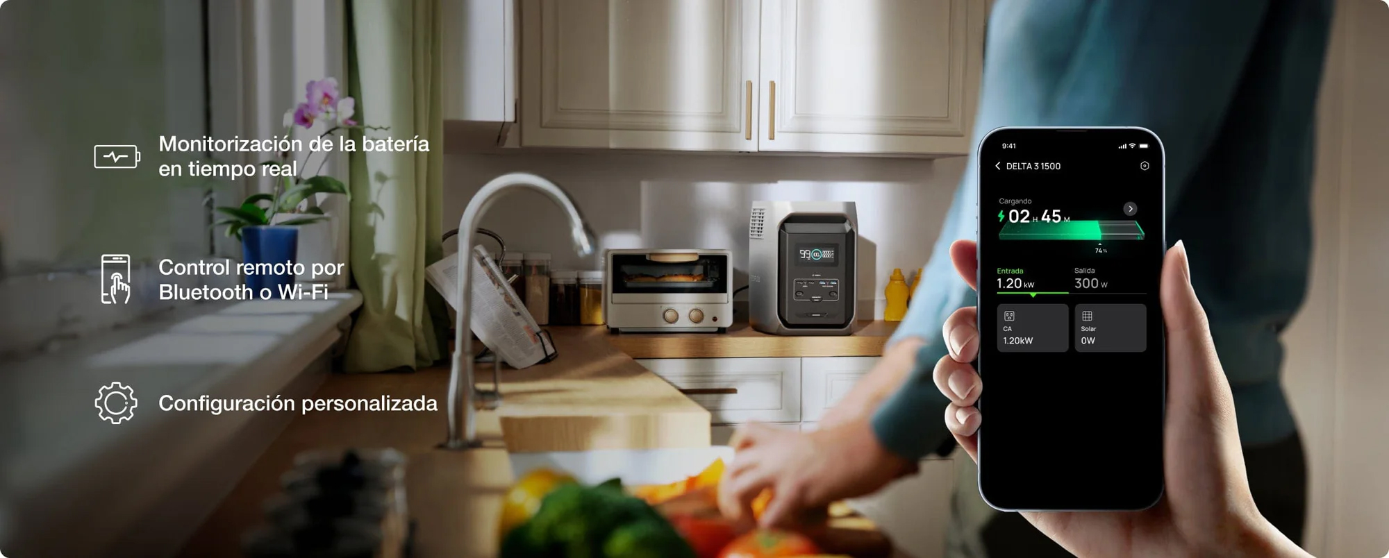 DELTA 3 (1500) ofrece una gran capacidad de batería de 1536 Wh, ampliable hasta 5500 Wh. Mantén tus electrodomésticos en funcionamiento; para uso diario o como energía de respaldo para el hogar. Es energía flexible y bajo demanda.
