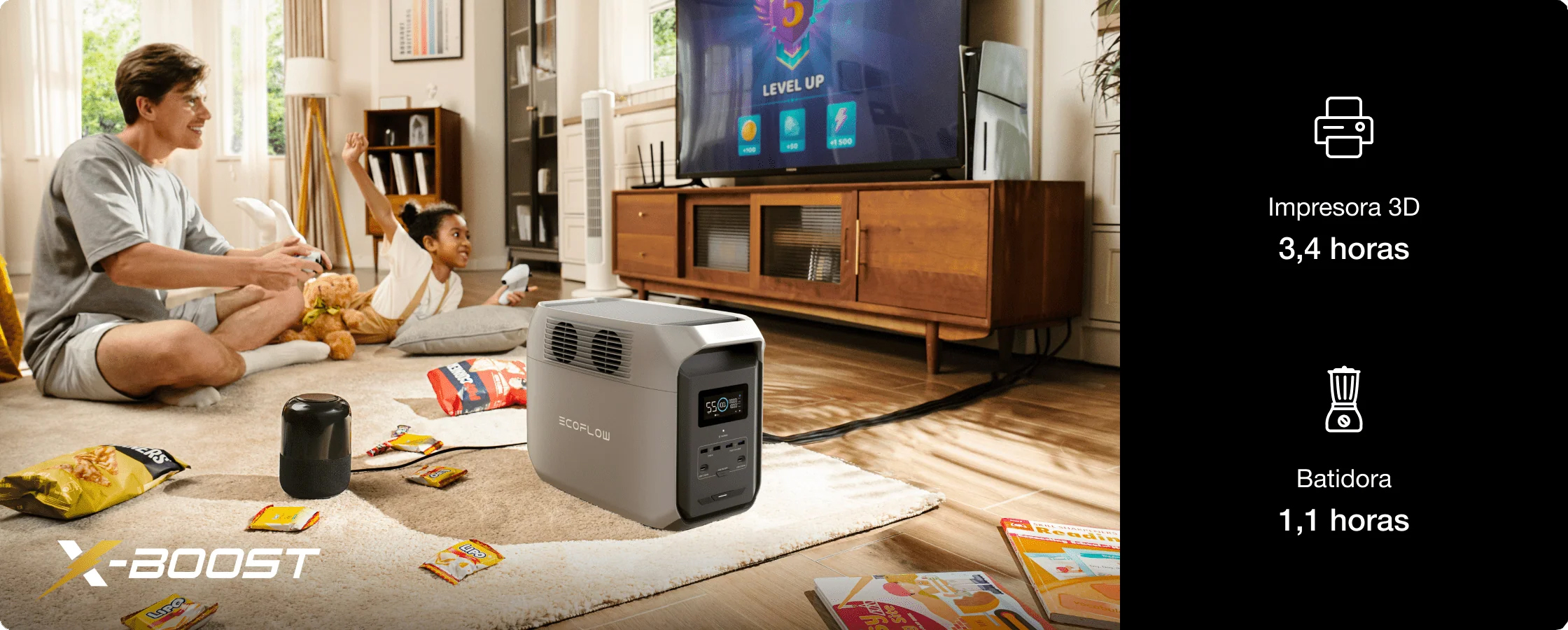 EcoFlow DELTA 3 (1500) puede alimentar el 99 % de los electrodomésticos, incluidos frigoríficos, televisores y ordenadores. Con X-Boost, utiliza sin interrupción electrodomésticos que consumen hasta 2400 W, desde hornos hasta secadores de pelo.
