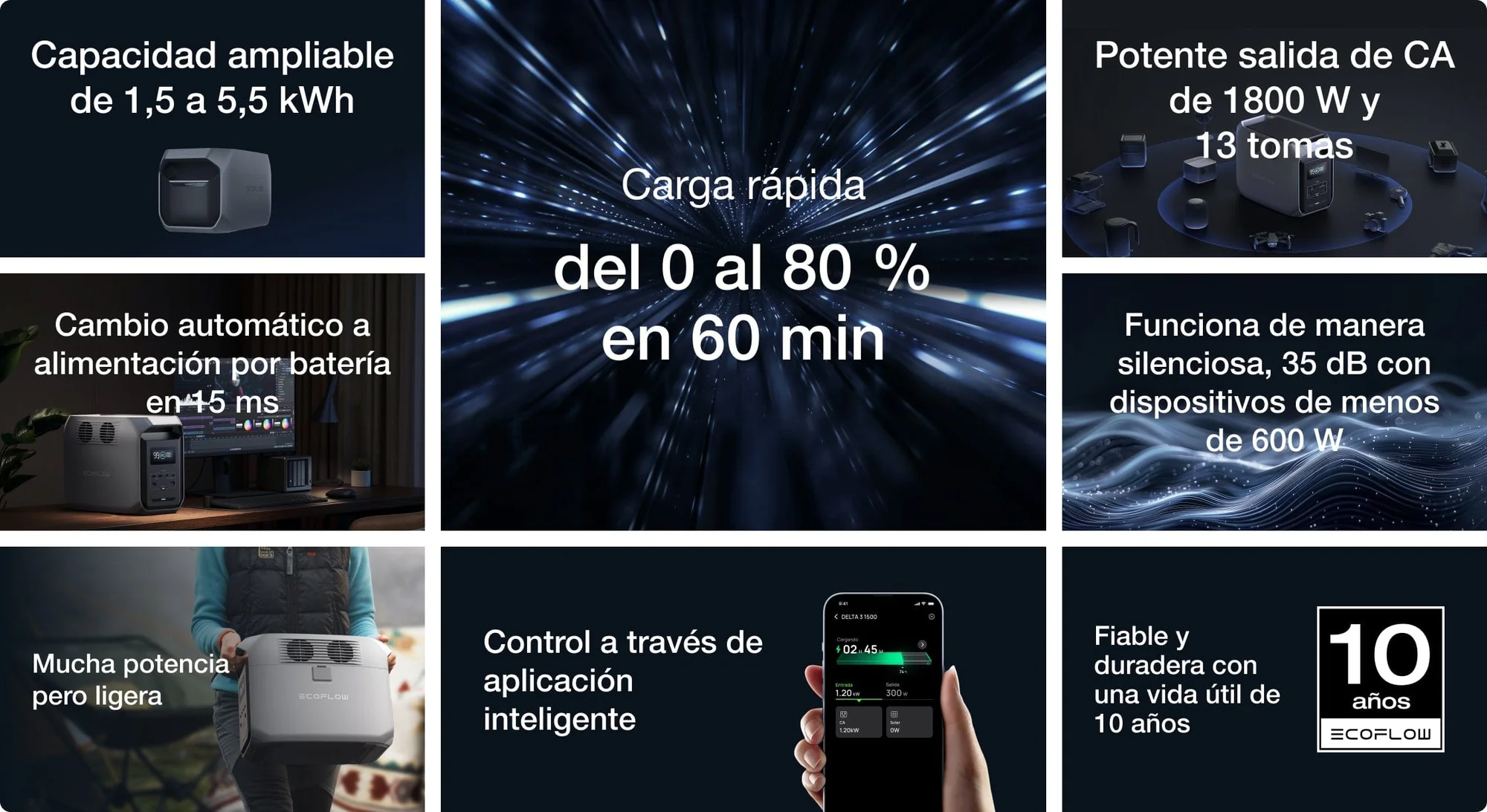 - [Rendimiento ultrasilencioso y tiempo de transferencia de menos de 15 ms] Equipado con tecnología X-Quiet la estación de energía portátil EcoFlow Delta 3 1500 funciona a solo 35dB para cargas inferiores a 600 W y 45 dB para hasta 1200 W. Este rendimiento ultra silencioso garantiza noches tranquilas en casa o en espacios reducidos. En caso de un corte de energía, el tiempo de transferencia es inferior a 15 ms, perfecto para proteger copias de seguridad de datos críticos, sistemas NAS, servidores o terminales POS. Su generador eléctrico mantiene todo funcionando sin problemas.