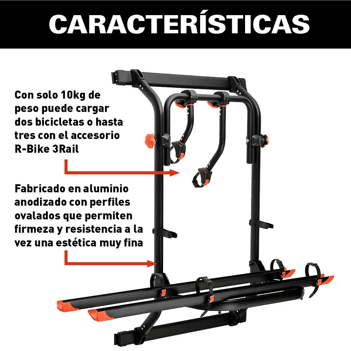 Ligero, práctico y seguroEl portabicicletas R-Bike Van es la solución ideal para transportar de forma segura tus bicicletas y bicicletas eléctricas mientras viajas. Su estructura innovadora, con un peso inferior a 10 kg, te permite transportar, con un accesorio diferente, hasta 2 bicicletas eléctricas o 3 bicicletas estándar con total seguridad gracias a su robusto marco de aluminio anodizado. | ¿Tu única preocupación? Disfruta del viaje.Dispositivos antivibración integrados para un máximo silencio en la carretera. Dale a tus compañeros de viaje la máxima comodidad gracias a los nuevos dispositivos antivibración integrados en la estructura del portabicicletas R-BIKE VAN, diseñados para disuadir el ruido no deseado y hacer tus viajes aún más agradables. | Diseño personalizado multiusos. Una sola estructura para todos tus pasatiempos.El portabicicletas R-Bike Van está diseñado para fomentar tus pasiones, sea cual sea lo que sea. Es por eso que hemos creado una estructura versátil que, gracias a su riel de bandeja, se puede transformar para adaptarse a tres alturas diferentes, por lo que es más fácil cargar y descargar las bicicletas. Además, utilizando accesorios específicos, puedes transformar el portabicicletas R-Bike Van en función de tus intereses y, además de bicicletas, también llevar esquís, tablas de surf y tablas de snowboard. (Los accesorios compatibles se venden por separado) |