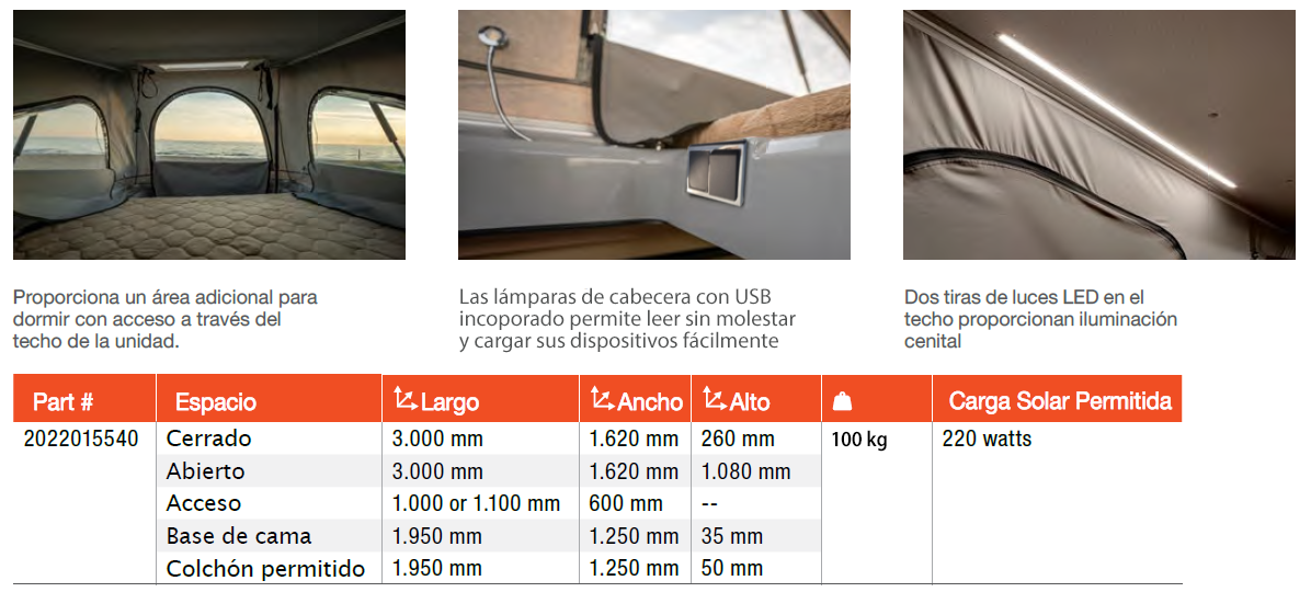 - Techo elevable termoformado de ABS con apertura manual asistida de excelente aislación, firme y liviano.