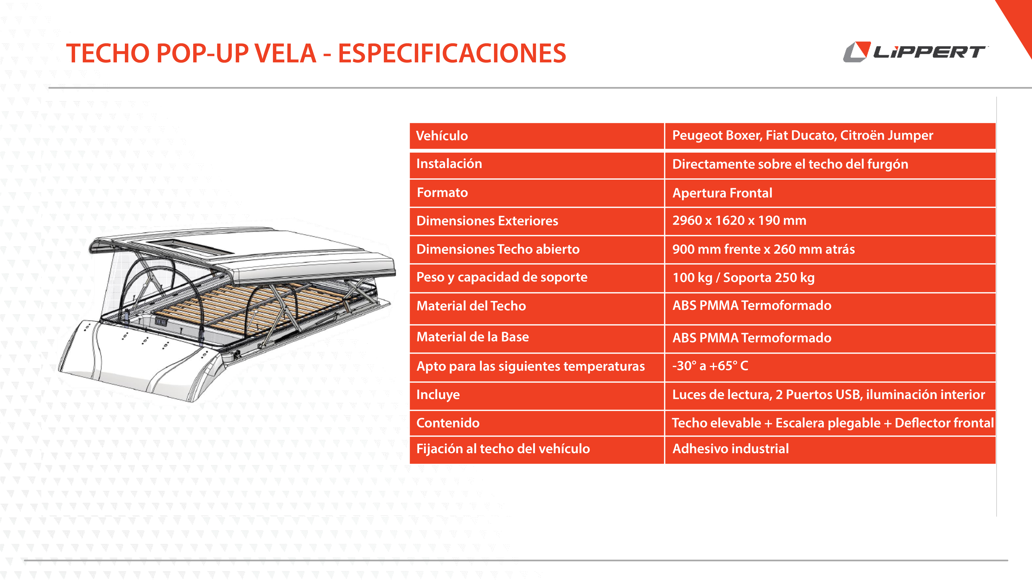 Este techo elevable, fabricado en Europa, se crea mediante un proceso de termoformado denominado doble lámina , que consiste en unir dos láminas termoformadas con una cámara de aire. Esto crea un techo muy robusto a la vez que ligero, con un peso entre un 20 % y un 30 % inferior al de productos similares de fibra de vidrio. Además, se puede inyectar aire caliente o frío en la cámara para regular la temperatura de este espacio adicional. Otra ventaja de esta tecnología frente a los techos elevables de fibra de vidrio es la posibilidad de industrializar la producción, lo que permite fabricar grandes volúmenes en masa manteniendo unos estándares de calidad uniformes. Una característica original es el sistema de elevación, que cuenta con un mecanismo doble , tanto de pantógrafo como de plegado: permite ganar altura incluso en la parte inferior. En comparación con la primera versión, la Vela tendrá un mayor espacio interior : una vez abierto, el techo queda mucho más alto en la parte delantera y trasera. Hasta la fecha, los análisis realizados por Lippert han demostrado que el techo elevable del Fiat Ducato ofrece un mayor espacio interior que el de todos sus competidores. El sistema de apertura del techo también se ha modificado y simplificado : ahora una sola palanca libera ambos cierres de seguridad simultáneamente.